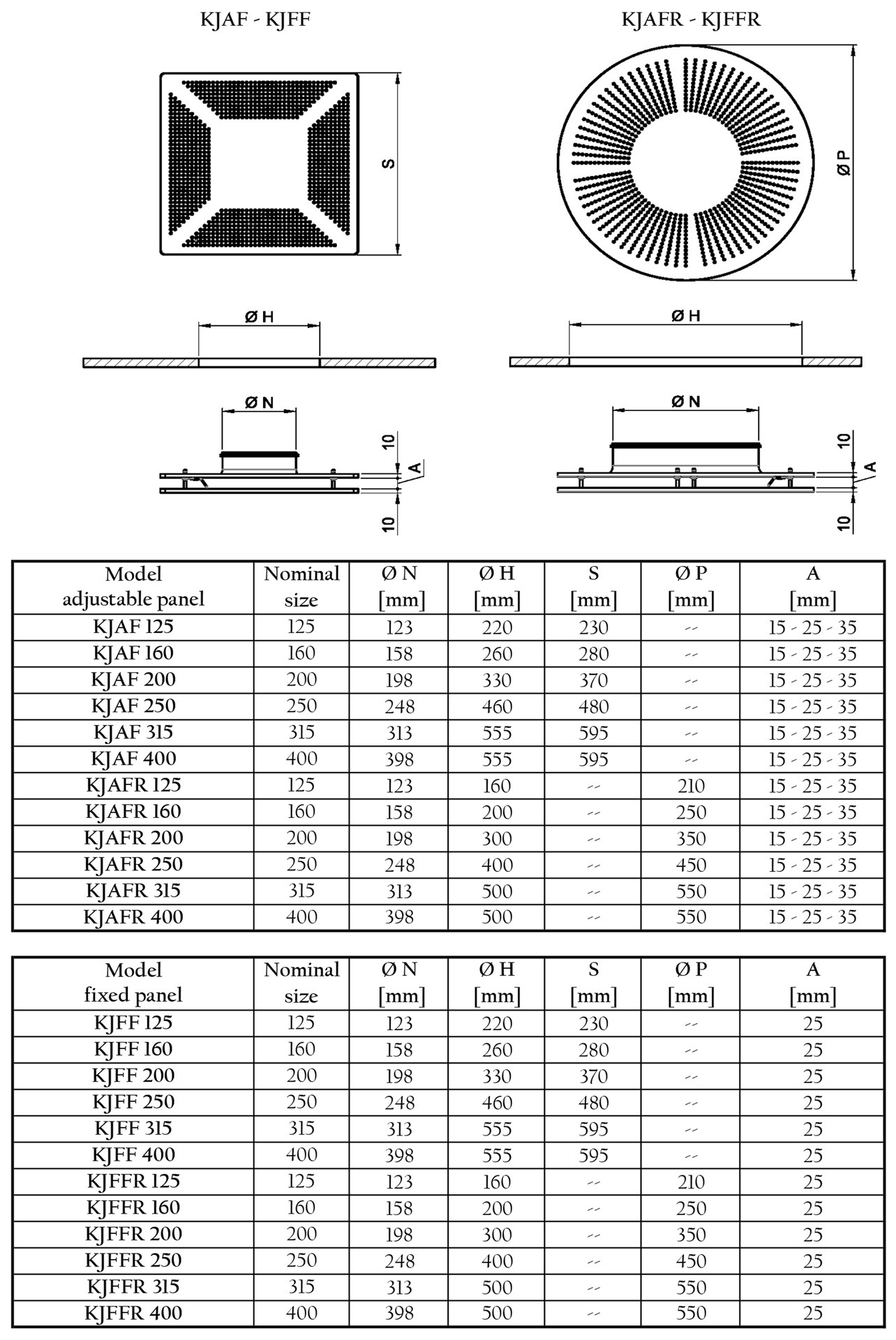 The KJF series units are ceiling diffusers with perforated front panel suitable for both supply and extract air. Characterised by a predominantly horizontal throw, they are particularly effective in cooling with false ceiling installation at medium height.